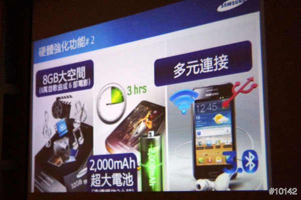 ▲因為重視影音娛樂,所以 Galaxy Beam儲存空間有多大呢?內建是8GB大空間,若換算成音樂,大概有8萬首歌曲或6部電影的空間,當然片長不同還是會多少有點差別啦,此外也可插MicroSD來擴充儲存空間;而內建電池有2000mAh,就算一直電影也可以有3小時的續航力。在連接部份也非常多元,可以用藍芽、USB等做分享的動作。