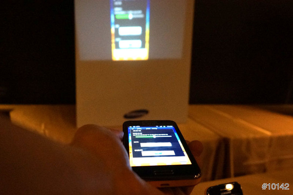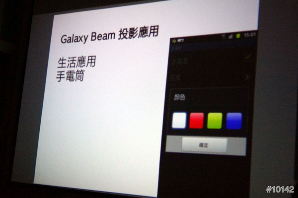 ▲這個角度可見到啟動投影功能的Galaxy Beam英姿,15流明微型投影,據稱投影的LED使用夀命長達20,000小時