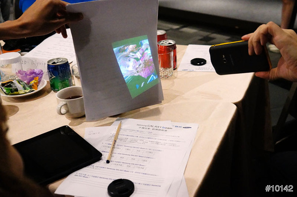▲前方所設立了Galaxy Beam的體驗區,為了充分展現Galaxy Beam的微投影特點,今天的燈光都略暗些,所以拍照起來有點模糊,如果有手震的話,也請大家見諒