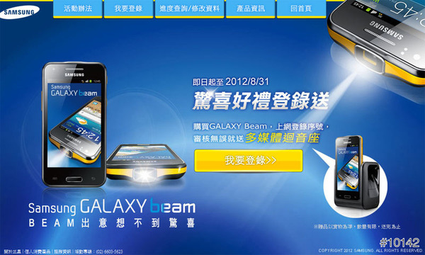 《1》凡於8/31購買GALAXY Beam手機,憑手機IMEI碼及S/N碼上網登錄,即可獲得贈品:多媒體迴音座一個