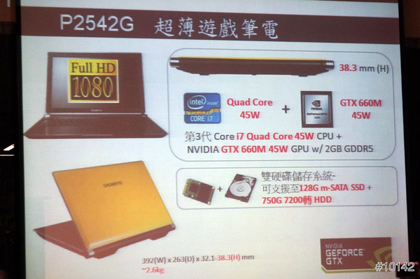 ▲緊接著進行P2542G的說明,其實技嘉的GAMING NB這款算是第二款了,這一款可以說非常高規,和一般其它品牌的設計理念不太相同;P2542G採用第三代INTEL Core i7四核心45W CPU,並搭配了NVIDIA® GeForce GTX660M GPU,看到GTX的規格,就知道是完全符合GAMING遊戲的使用。同樣使用雙硬碟儲存系統,可支援至128GB m-SATA SSD和HDD。