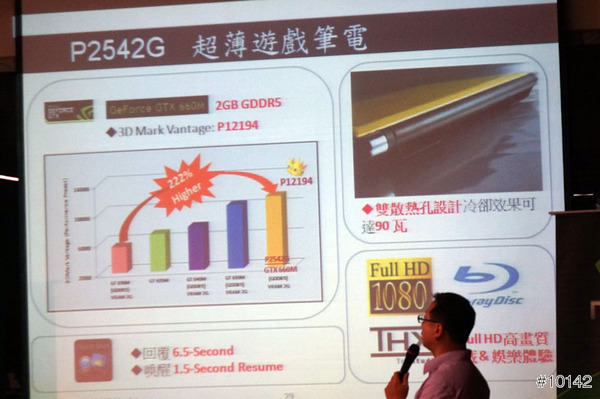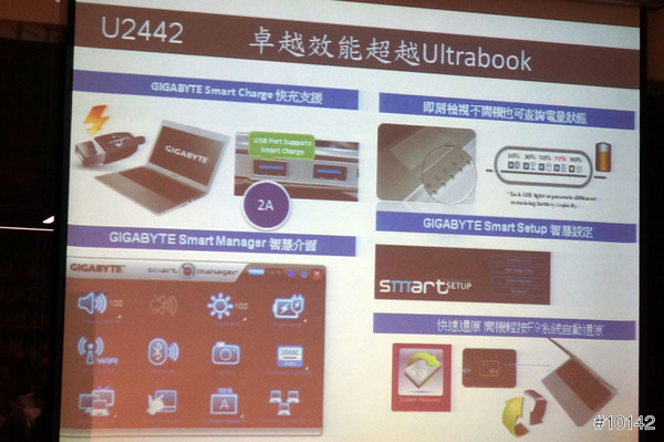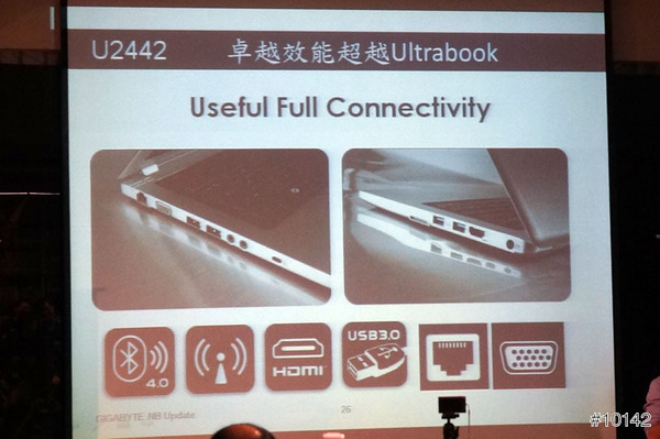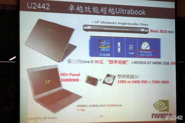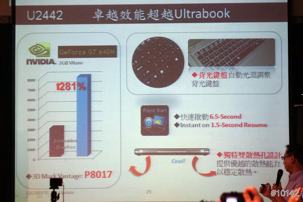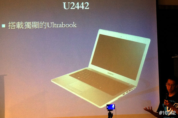 ▲接著文恩大大就開始介紹了今天技嘉所要體驗的兩款筆電;第一款是搭載了獨顯的ULTRABOOK:U2442,雖然看來比其它的ULTRABOOK略厚了一點,但內建了高效能的NVIDIA® GeForce 640M;因此也可說比起一般常規的獨顯機還要輕薄。