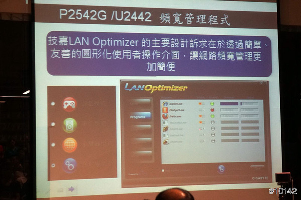 ▲而P2542G/U2442也有搭載技嘉獨門軟體LAN Optimizer,這軟體的主要目的是透過簡單的介面設定,可以輕鬆進行頻寬的管理,例如同時在進行BT下載、線上遊戲、又在上網,這時會發現P2P的BT會把頻寬佔滿,這時透過LAN Optimizer圖形化管理介面,就可以簡單對頻寬進行優先順序做設定,這樣就不會影響工作的進行。
