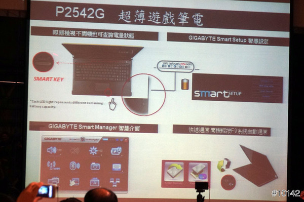 最後在簡報結束前,文恩大師也特別說明,目前許多筆記型電腦廠商都比較著重在硬體的價格,一直在壓低硬體價格,不重要部份都Cost Down,而技嘉則非常用心,還設計了實體的多功能鍵,可以直接選擇進入BIOS或系統還原等,對於使用者非常貼心,值得稱許。