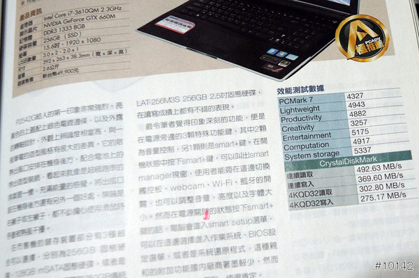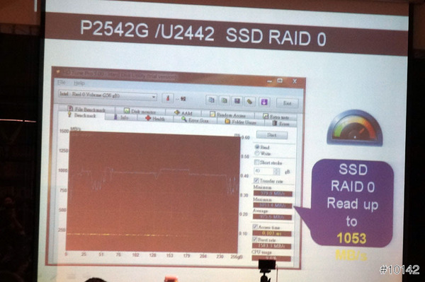 ▲其實今天的這兩台筆電P2542G/U2442都有雙硬碟系統的設計,可以插上雙SSD來進行RAID功能,經過測試在資料讀取可以到 1053MB/SEC,可以說遠超過一般硬碟的不到100MB的速度。