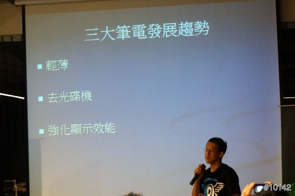 ▲文恩一開始就說明上半場的內容,目前筆電有三大發展趨勢,第一個是愈來愈輕薄,接著是光碟機的存在,第三點則是愈來愈強化了顯示的效能