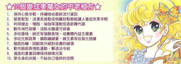 阿泰最後把各個美魔女的保養心法整理成10條,如果未來有志成為不老妖怪青春有駐的美中年的話,不妨從現在就開始努力實行吧!(點擊可看大圖,至於為什麼是喬琪?因為她的年紀也真的夠格稱為美魔女了...)