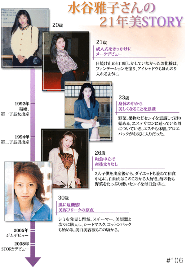 現年44歲的水谷雅子,是美魔女大賽的首屆王者,宛如20多歲的膚質和身材,甚至曾引起是否謊報年齡的質疑。極具說服力的外在條件,讓水谷成為日本主婦的偶像,日前甚至還出版美魔女的保養書。