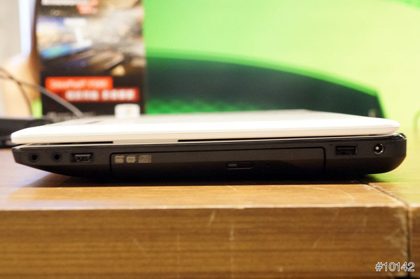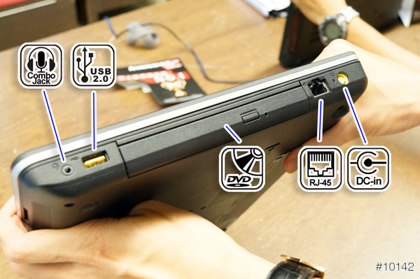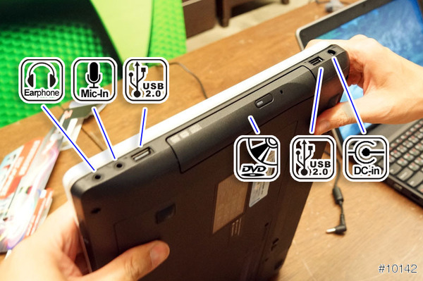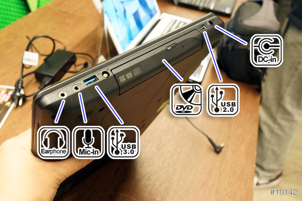 DC-in變壓器充電孔、USB2.0、DVD光碟裝置、USB2.0、MIC-IN麥克風輸入、Earphone-Out耳機輸出。