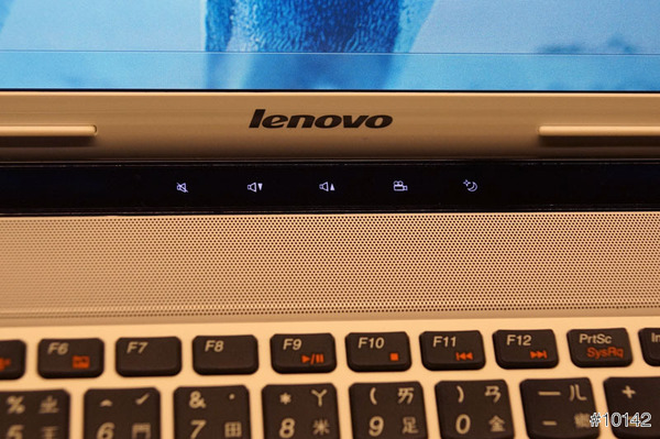 ▲除了鍵盤的功能鍵外,中間喇叭上方也另有觸控式按鍵,分別可設定聲音大小、靜音、螢幕播放模式和效能模式。