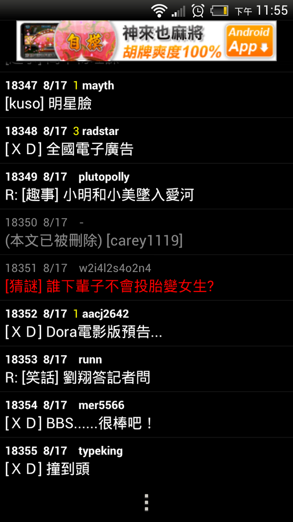 在我的印象中,BBS Reader 似乎是 Android 上第一款將 BBS 版面轉為直行顯示的軟體,它最大的特點就是將 BBS 文章畫面轉成像是網頁 RSS 一般的閱讀方式,加大的自己以及點選操作在手機上頭使用十分方便。但這種排版最大的缺點就是會改變原本 BBS 畫面的排版,如果是表格就會完全亂掉,而動畫與進版圖等更是都看不見了。BBS Reader 似乎已經一陣子沒有更新,「熱門看板」這個功能已經失效了,一些設計也都稍微落後,同樣的排版有後起之秀 Mo-PTT 跟 Miu PTT 表現來得更好。