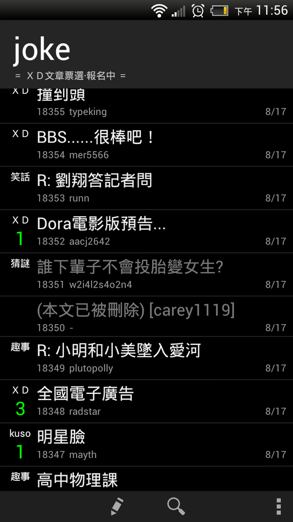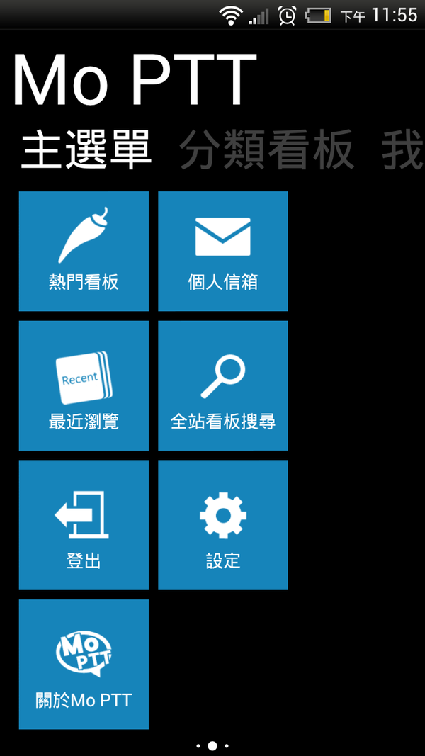 Mo-PTT 是從 WP7 跨界過來 Android 的,從介面上可以看得出來有濃濃的 WP7 風格,十分的簡潔俐落,在排版上也比 Miu PTT 豐富一些,雖然都是為手機特別設計過的版面,但 Mo 在顏色的運用上更分明,讀過的、沒讀過的、推文超過10的,爆的,等等的文字顏色與大小都十分賞心悅目,也一樣有著手勢拖放的上一頁功能,使用起來也十分流暢。唯一我認為缺失的地方是在搜尋功能上,有時候在搜尋版面時會發現一直搜尋不到那個版面,得退出到別的功能再回來才搜尋得到,這或許是一個 BUG?