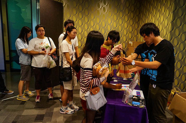 ▲進入會場後,大家都超有禮貌地魚貫排好領取姓名牌和伴手禮囉!