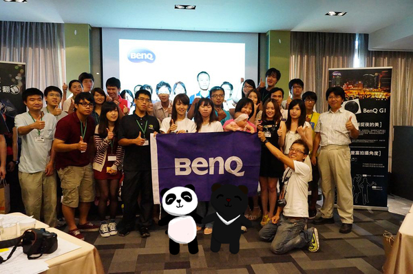 ▲聽完小組長分享今天體驗的心得後活動也到了尾聲,Vicky 便呼喚全場的網友還有貓熊葛格和黑熊底迪趕緊到台前搶個好位子拍張大合照! 對於 BENQ 在研發高階相機的用心大家都有志一同地說讚^^