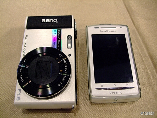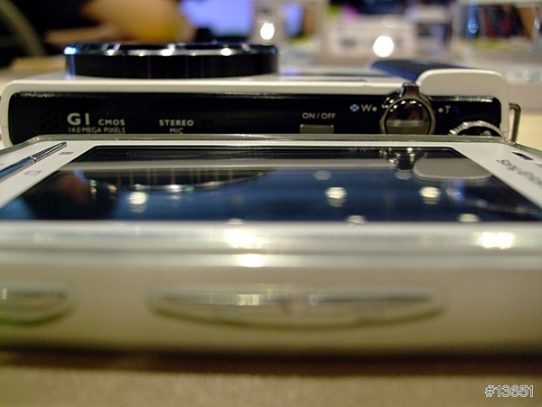 接下來比厚度,這樣看過去G1稍微比Xperia厚了1/3,畢竟是相機不是手機嘛,總要給鏡頭變焦什麼的。不過G1的鏡頭收起來真的很薄,聽講師介紹是用了特殊的技術讓鏡頭的厚度變得更薄,這樣一來收進包包或是口袋就不會因為鏡頭突出來而卡卡的,或是刮到其他東西。