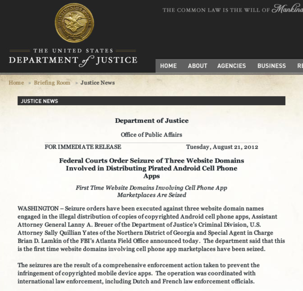 被查獲的三個網站是 applanet.net、appbucket.net 及 snappzmarket.com,而令人在意的是,雖然這三個網站伺服器都不是在美國境內,但他們已經掌握了足夠的證據來關閉這些網站(事實上,現在這三個站連上去之後都只會秀出本文第一張圖片)。唔,這是不是讓你聯想到 Megaupload 呢?一樣是伺服器放在境外,一樣是被 FBI 關閉。在 Megaupload 被查封之後,許多免費空間網站風聲鶴唳的「自行約束」,有些是直接關閉網站,有些是限制分享功能,看來在這次查禁 Android 盜版網站之後,其他盜版網站、論壇也會慢慢的銷聲匿跡。唔,看來這些「洋人的黑暗東西」都將會跑到中國大陸存活吧,看看 115 的崛起…。