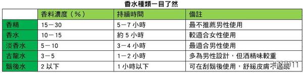 香水依香料濃度和香味持續時間,大致可分成香精、香水、淡香水、古龍水、鬍後水5種,一般男香的香料濃度多在淡香水之下,也有部分產品可歸為香水等級。阿貓不建議使用香料濃度太高的產品,因為氣味過於張揚,除了使嗅覺受干擾,還容易給人「庸俗」、「花俏」的負面觀感,還是淡淡香氣最能獲得旁人好感。