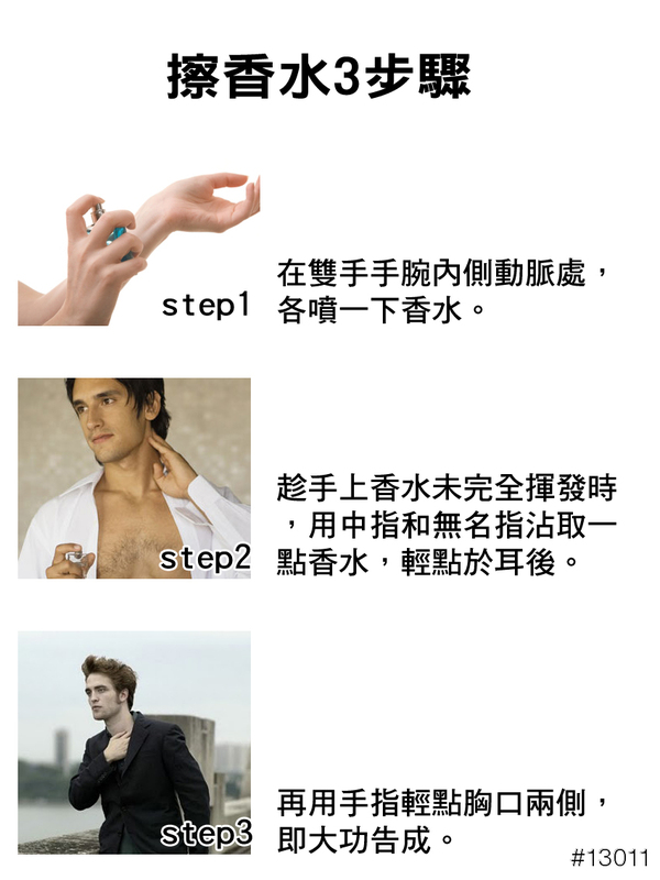 男性噴香水最忌諱香味過濃,除了選對香水類型外,手法也很重要。使用時,在雙手手腕內側動脈處,各噴一下香水,再用中指和無名指沾取,輕點於耳後及胸口。若皮膚容易過敏,也可以將香水噴在領帶或衣物上,但此法只適用透明質地的香水,否則容易在布料上留下汙漬。