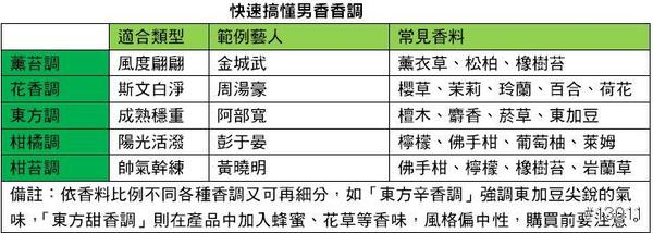 一瓶香水適不適合你,「香調」是最重要的參考指表,常見的男香香調有薰苔調、東方木質調、柑苔調、花香調,每種香調都能給人不同感受,如東方木質調氣味溫和持久,適合沉穩的男士或在嚴肅的場合使用;花香調清新活潑,很襯陽光型男,在外遊玩使用也不突兀。