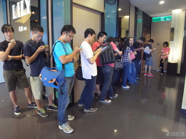 我們為了前十五名的禮物(Ozaki iCoat Versatile iPad2/New iPad多功能折疊保護套),所以提早了一點點到,沒想到有很多人都到了呢!而原本大家都還很悠哉的在喝飲料,突然又咻的一下就衝過去排隊了!!我們只好放下手邊的飲料也趕快過去,現場沒有發放號碼牌,也不知道誰先誰後,還好我們還在15名之內|||b