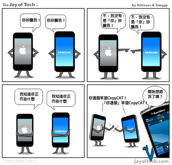 蘋果與三星的世紀審判結果已經出爐,雖然是以三星敗陣收場,但是你真的覺得三星有抄襲嗎?Well…這邊有一份簡單的測試,測試看看你覺得三星跟蘋果到底誰有理! ▲ 「你抄襲我!」「你抄襲我!」「你抄襲我!」「你抄襲我!」…(來源:joyoftech) ▲ 簡單的測驗,測驗你覺得 三星 或 APPLE 哪個是對的!(來源:joyoftech) 3 個人說讚 收藏 快速回應 引言回應