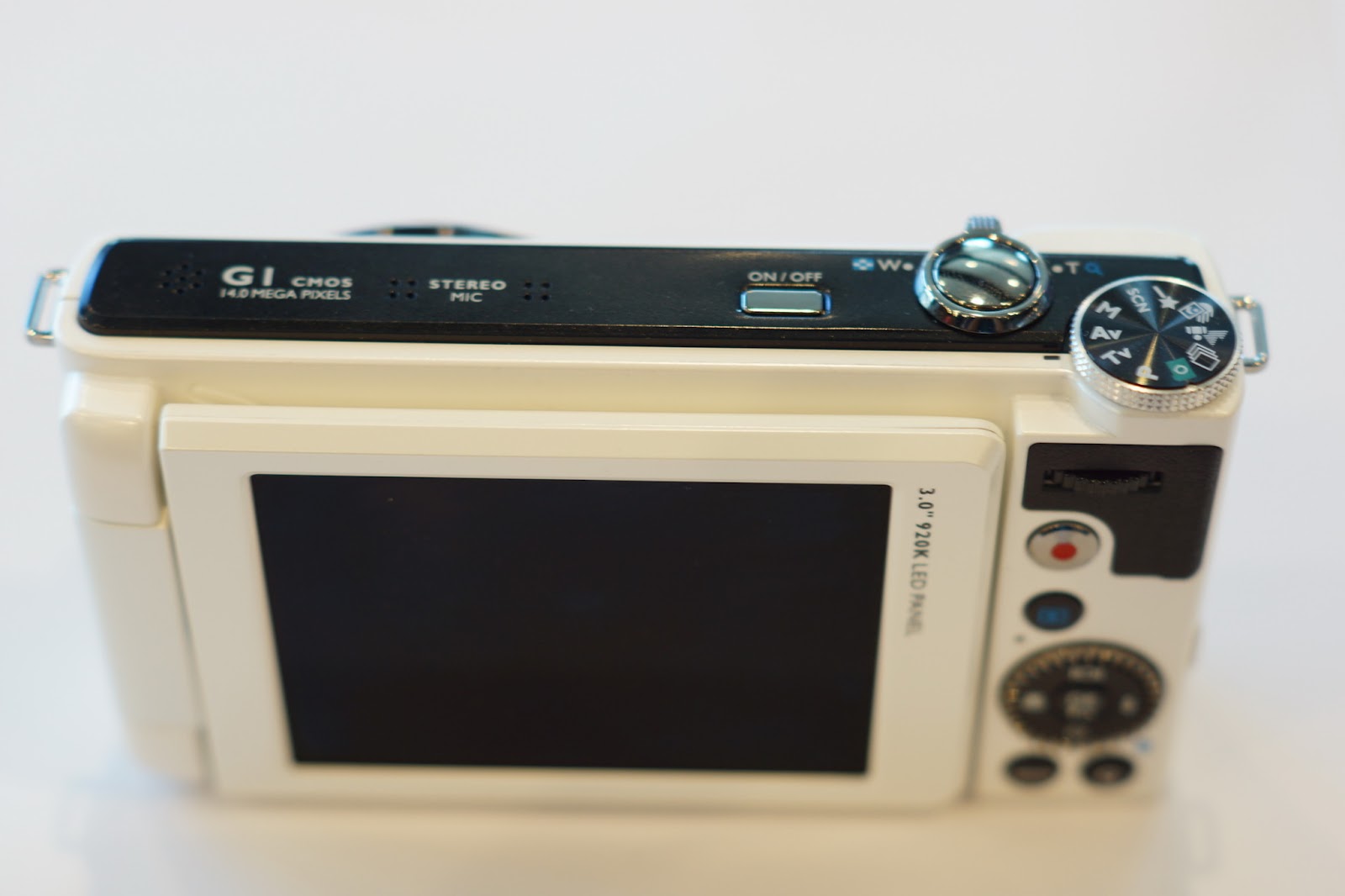 機頂上方大大的寫上了G1,採用1千4百萬畫素的CMOS感光元件,雙聲道收音麥克風,電源開關,變焦拉桿結合快門,以及實用的功能轉盤。