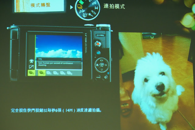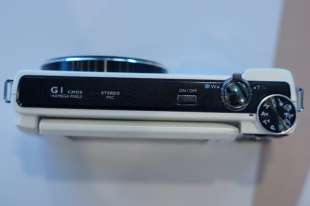 機頂上方大大的寫上了G1,採用1千4百萬畫素的CMOS感光元件,雙聲道收音麥克風,電源開關,變焦拉桿結合快門,以及實用的功能轉盤。