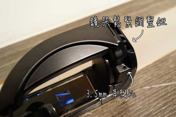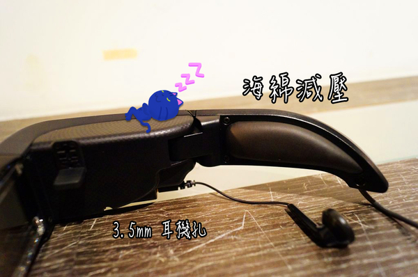 ▲在 BT-100 兩邊鏡架的內側都經過了海棉減壓處理,可以減輕長時間配戴時對頭部兩側的壓力,真是貼心的設計! 另外左右兩邊都各有一個 3.5mm 耳機孔,可以讓使用者自行更換喜愛的耳機以滿足不同的需求。納美喵:「減壓設計真是舒服啊 zZZ」