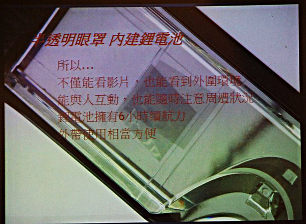 ▲BT-100 的鏡片是半透明設計,也就是說即使透過 BT-100 觀看影片的途中,也可以看清楚四周圍的情形,比起一般頭戴式顯示器不透明的設計方便很多,這樣一來要是家人或朋友想要在使用中和我交談也能立即反應。此外內建的電池充飽後,可以持續六小時撥放影片,大約可以看個三四部電影,續航力可說是相當充足!