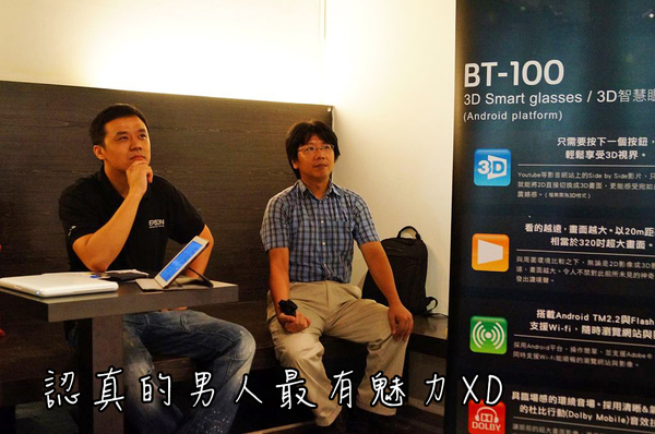 非常榮幸能夠參加今天的 EPSON BT-100 體驗會,今天透過自己的眼睛實際體驗了 BT-100 後,我覺得 BT-100 3D智慧眼鏡在重量方面有相當好的競爭力(雖然有些網友覺得還太重,能夠越輕當然是越好拉XD )同性質產品其他廠牌的重量幾乎是 BT-100 的兩倍,所以我覺得這一點很值得認同與鼓勵,而眼睛鏡片中的兩塊 960*540 qHD 解析度的螢幕畫質表現也非常細膩,不容易發現有像素點的存在。此外原生支援無線網路更方便使用者透過智慧型手機行動網路的熱點分享給 BT-100 使用,以得到更舒適的影音使用經驗。至於我覺得在操作方面以及內建軟體方面是未來可以再做進化的部分,比方說遙控器上的觸控板可以加入多點觸控的功能,這樣對於圖片或是網頁瀏覽時會更人性化,另外就是希望 BT-100 可以早日取得