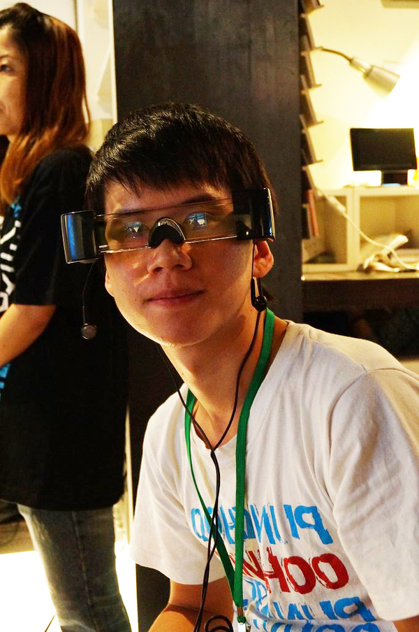 接著為各位附上幾張當天坐在我附近網友實際戴上 BT-100 體驗的模樣,看起來感覺非常前衛啊!