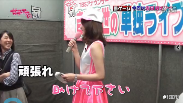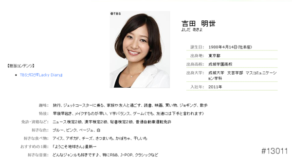 曾獲得成城學園選美小姐冠軍的吉田明世,是跟古谷有美同期進入TBS的新人主播,外表亮麗,還沒畢業就考上TBS、朝日、富士、日本等多家電視台,入社後在「Nスタ」節目中負責娛樂新聞和天氣播報。個人檔案中據稱專長是化妝很快,在「女主播的懲罰」中曾被迫卸妝,素顏底子雖然還算不錯,但本人應該很後悔當初怎麼不去其他電視台,淪落到在這被人糟蹋。