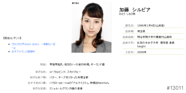 加藤シルビア在TBS的個人檔案中,寫著特長是低卡路里創作料理,喜歡的食物卻是奶油跟起司,是個充滿矛盾的混血女孩。母親是波蘭人,出身於名校御茶水女子大學,個性直快敢言,認為自己是TBS最有人氣的主播,不過可能因為負責的都是晨間節目,知名度並沒有很高。在「女主播的懲罰」中因為大媽般的體型和動作,以及有點差的時尚品味,經常被節目惡整,曾在懲罰遊戲中被迫穿ET布偶裝從家裡騎腳踏車到電視台上班。因為常被田中みな実吐槽,兩人在節目中常常鬥嘴,不知感情是好還不好。