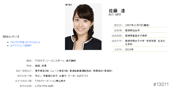 宮城縣出身的佐藤渚,在進入TBS前就已經以模特兒、地方偶像等身分在仙台一帶活躍,直到2010年才考進TBS,跟小林悠是同期。私底下打扮時尚的她,因為高中就讀鹽釜女高,被同是宮城出身的主持人伊達冠上「蛤蟆女(日文釜與蛤蟆音近)」稱號,兩人激烈的仙台腔鬥嘴也成為節目的名物之一。