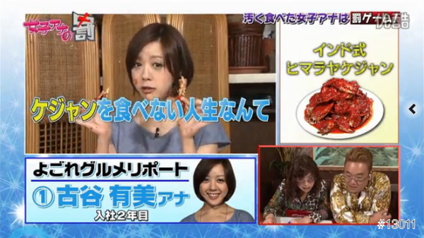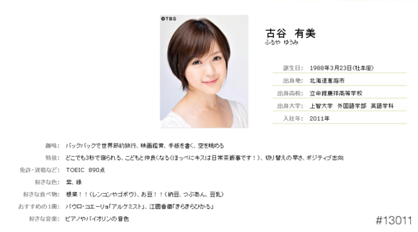 外表清新可愛的古谷有美,在上智大學期間曾榮獲校園選美「上智小姐」的后冠,去年才進入TBS,跟吉田明世是同期。目前還算是菜鳥主播,不過個性十分認真,口條清晰,是很有潛力竄紅的主播人選,不過在「女主播的懲罰」中也是照樣被惡整,吃醬螃蟹吃得滿臉都是的可憐模樣,據說贏得不少重鹹觀眾的青睞。