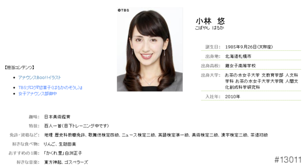 美日混血、有張熟女臉的小林悠,大學時代就以自由主播身分參與電視演出,2010年進入TBS,跟加藤シルビア是御茶水女子大學的同屆同學。最有趣的是,小林悠明明有著混血的歐美臉孔,卻喜歡研究佛像、日本古典美術,據說每個禮拜都搭新幹線去京都看大佛,薪水幾乎都花在交通費上。她在「女子主播的懲罰」節目裡面也經常自顧自地談論佛像、佛經、肉身佛等異次元話題,被無奈的主持人伊達稱為「宇宙人」。