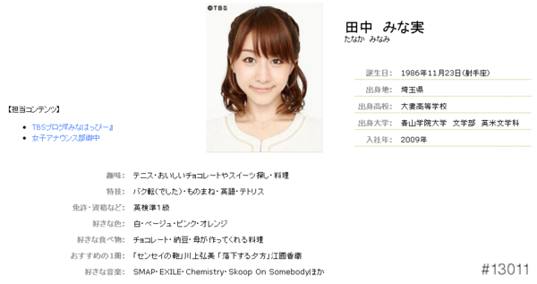 田中みな実在進TBS前就當過雜誌模特兒,入社後靠著153公分的可愛嬌小外表,配上刻意營造的做作女形象,成功打出知名度,算是TBS新生代女主播中能見度比較高的。在美國紐約出生,英文流利,平時播報新聞時嚴肅專業,但一上綜藝節目馬上就變成討人厭的做作千金,曾被名嘴DELUXE松子稱為「最惹人厭的女主播」。特技是在節目上炫耀自己周遊列國(?),以及挑釁加藤シルビア。
