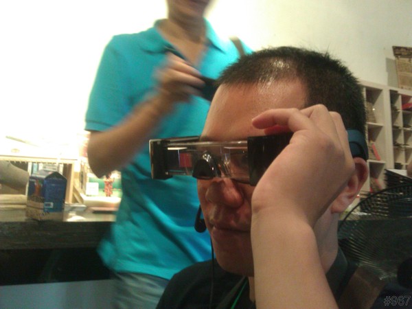組員試戴,不過我們因為有戴眼鏡,全部重量都押在眼鏡的鼻架上,很痛!!!!隨然有眼鏡架可是效果感覺不明顯