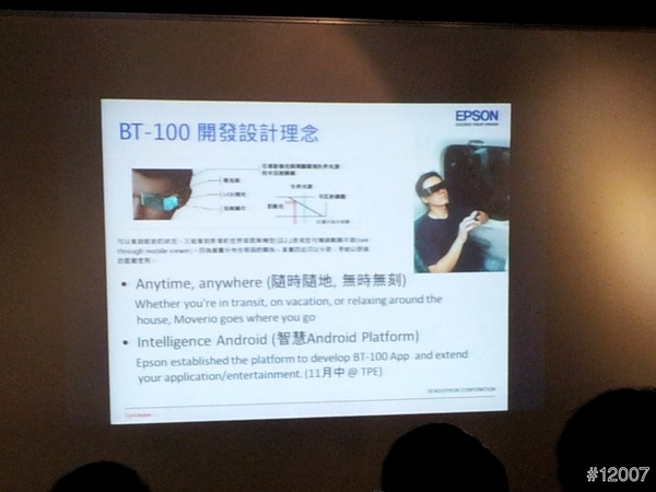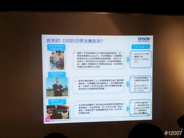 開始由主持人T客邦的小編,來帶領大家進入這次的EPSON 3D智慧眼鏡 BT-100新品體驗會,接著由EPSON PM Jason 來對EPSON 3D智慧眼鏡解說,利用簡報方式來說明,使用情境與行為,用商業和個人區分,及消費目標族群、未來聚焦賣點等等,但重點的是開發設計理念,會想出這樣的產品,一定有它的需求才會產生BT-100囉。