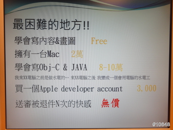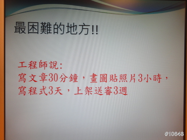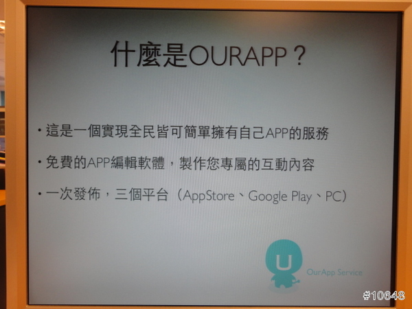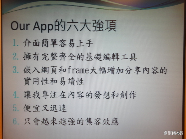 1. 豐富的Our App軟體說明, 但礙於時間所限, Jason無法就全部功能做說明及讓網友有自行試做的時間. 建議主辦單位考慮此類活動可分兩至三個星期六或日來舉辦, 使網友有足夠時間體驗及瞭解該教學主題 (Johnny 提議的兩天一夜體驗營, 也挺令人期待的)<( ̄︶ ̄)>