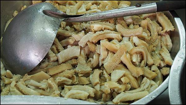 牛肚切成長條狀,因為牛肚帶嚼勁,切小塊咬起來比較順