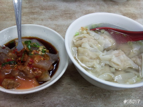 我要推薦的是1間位於苗栗市南苗的江技舊記~店裡賣的是麵食類!主打招牌是餛飩和肉圓!第1次去時是跟男朋友的約會時...那時不知道要吃什麼於是他推薦我進這家店去品嚐...進去時想說...哇~也太多人了吧!!生意超好的...櫃台收銀員和服務生手都沒停過...我想著有那麼好吃嗎?(好奇)於是點了2套(餛飩湯&1粒肉圓)吃起來真的不錯耶...餛飩大顆餡很扎實!湯頭也很好喝!餛飩也可吃乾的然後配上他們的醬汁真的超好吃的....肉圓外皮是透明的裡面包有切角的筍子.豆乾.絞肉!但可能是因為是用炸的肉圓所以唯一美中不足的地方就是油了點.....╮(╯_╰)╭如果要到店裡吃的朋友可以直接跟老闆說要"1套"就包含了"餛飩湯/乾&肉圓1粒...馬上就可以好好的坐下來品嚐囉~價格還算ok^^