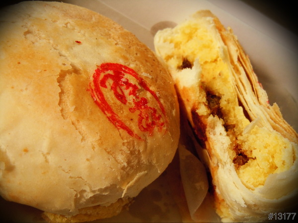 看到這,可能有人已經回想起那一口咬下的酥脆外皮,柔嫩甜蜜的綠豆沙與藏於餅心由蔥頭爆炒過的豬肉在嘴中相互推動,古早味被萃取的淋漓盡致,香氣韻回於鼻咽之間,口水源源不絕地湧出...(來張剖面照,用手扳成兩半~非常不專業〒ˍ〒)