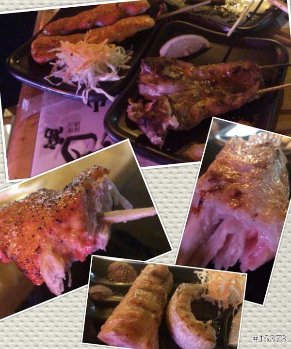 和大家分享照片中的美食有~~明太子雞肉串、鹽烤魚下巴、炭燒鮭魚肚~~~