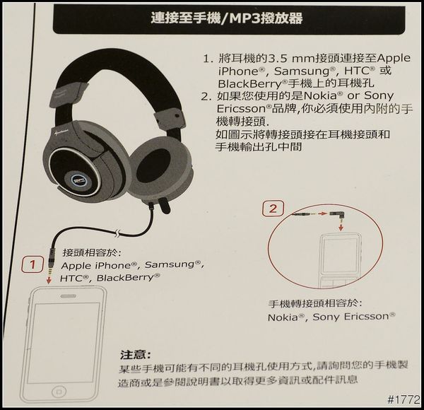 ▲如果要接上手機,可能就需要轉接頭(手機轉接頭相容於: Nokia®, Samsung® and Sony Ericsson®. )