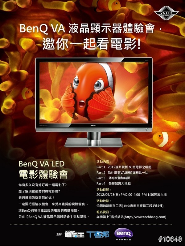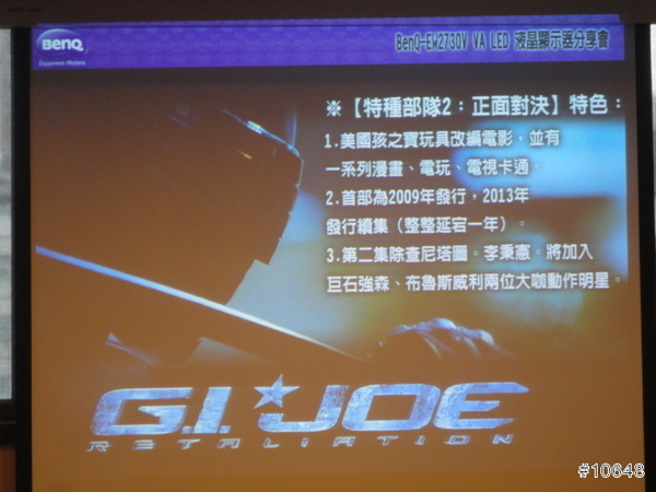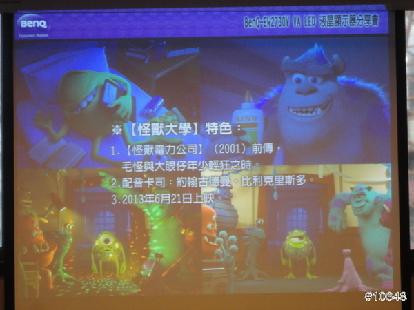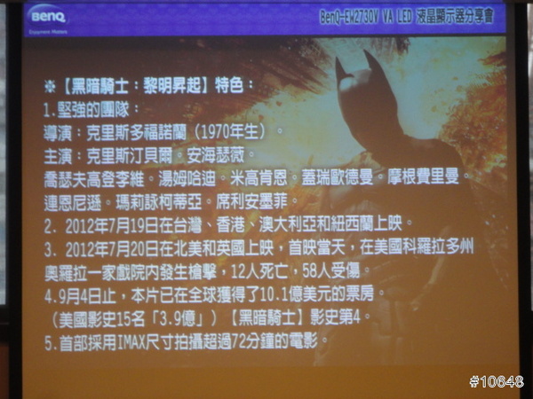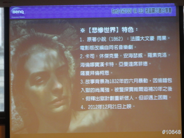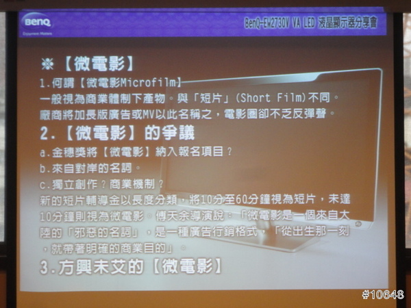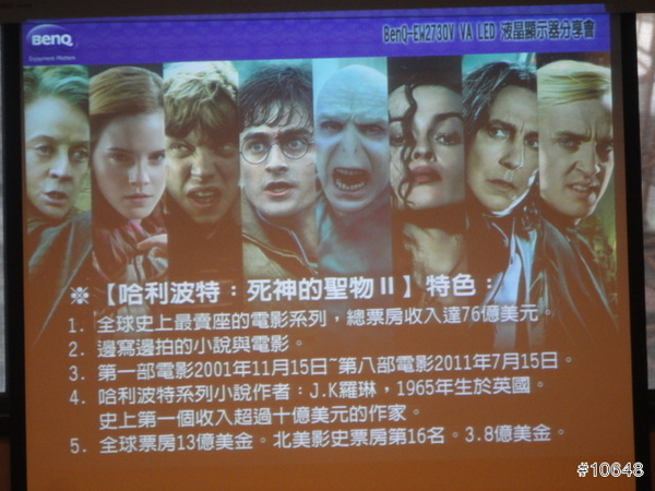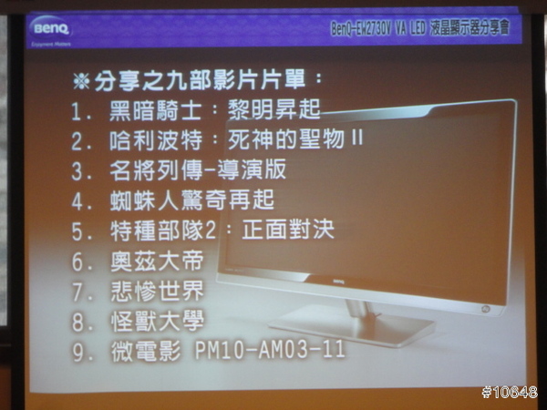 4. 由於受限藍光影片不可公開播放的緣故, 此次體驗會中的影片展示多為網路下載之預告片,畫質自然受限, 建議類似活動, 可準備BenQ公司自行製作的藍光試看片(我曾經看過, 畫質及色彩表現真的讚), 我認為網友應該更能感受到BenQ VA液晶顯示器的強大威力
