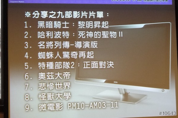 這次BenQ新出的螢幕真的很好,而且BenQ的螢幕一直是出名的好,我在現場看的幾隻預告片,螢幕表現都很好,不管對比,反應時間等等都真的不錯,讓我很想拿我的PS3放個藍光片來試試,這台已經在我的採購名單了,推薦給大家
