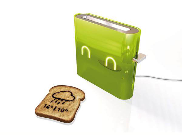 Nathan Brunstein 設計師就推出一款可以預報天氣的Jamy 烤麵包機,這款Jamy 烤麵包機具備有WiFi裝置可以接收即時的天氣預報,被直接"烤出來"印在吐司上面,讓你一邊吃早餐能知道今天的天氣。