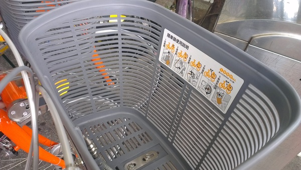 ▲ 雖然 YouBike 的車子造型十分特殊,但車上還是附了車鎖讓你安心,不怕停車去便利超商買個飲料出來車就神隱了。菜籃貼有車鎖使用說明。