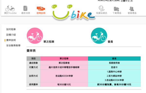 老實說,在 Youbike 出包之前,我還真的不知道台北市有這種服務,而當然也不會知道說它這是如何收費,有幾個租車點等等的訊息,而因為上次的大出包(見:台北好好拆?U-Bike 網站的合作對象很微妙)之後我才對這個服務有所認識,而也才會知道租這個腳踏車居然只需要悠遊卡就可以啪啪走了,而且前半個小時免費,後面每半個小時也僅收 10 元,使用悠遊卡就可以付費,真的是非常的便宜啊!